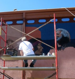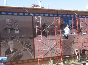 Artist Emanuel Martinez is now at work on the fifth panel, depicting stars from Red Rocks– from Ella Fitzgerald to Jerry Garcia. The latter, he tells us, is attracting a lot of attention to the project. There’s little doubt the concert panel will become the most popular of the six depictions of Morrison’s history, from dinosaurs to rock ‘n roll.