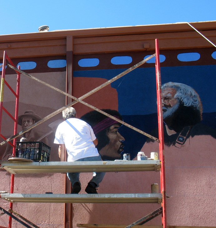 And yesterday, moving toward the present: Jerry Garcia and a CCC worker from 1930s Red Rocks keep a watchful eye while Emanuel works on Jimi Hendrix’s afro.