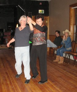 Before the festive evening got in full swing, dance instructor Lila (right) gave a few lessons to early comers. Here Margaret tries a two-step ahead of the crowd.