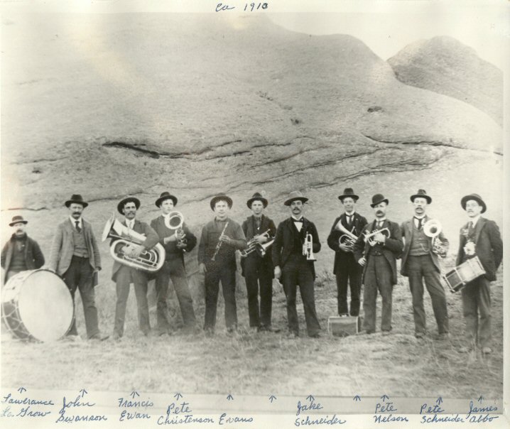This gathering of musical talent represents a “who’s who” of early Morrison families, including the town’s innkeeper (2nd from left), shoemaker (4th), apothecary (7th), and livery owner (right). Others include several town fathers who were the first aldermen elected in 1906. From left, at Red Rocks, the Morrison Town Band in 1910: Lawrence LaGrow, John Swanson, Francis Ewan, Pete Christenson, Evans, unknown, Jake Schneider, unknown, Pete Nelson, Pete Schneider, and James Abbo.