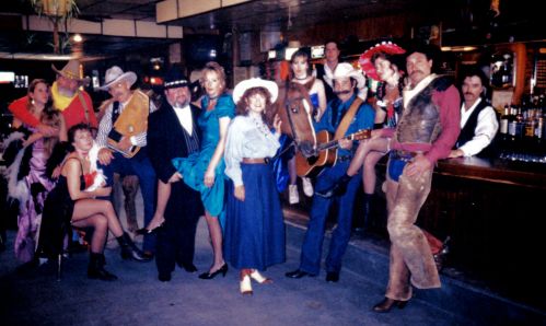 1996 performers gathered at Teresa’s Holiday Bar; Jerry Walker, Roz Brown, Bob Dougherty, Liz Masterson, Sean Blackburn. Also saloon girls with bar owner Kim Bianchi, cowboy Gary Gray, bartender Willie. Photo by Mary Jordan.