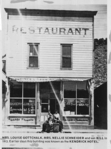 The Kendrick Hotel in Morrison was located at the present address of 311 Bear Creek Avenue. It was a two-story frame building with a covered stairway on the outside. The restaurant may have been next door at 309 Bear Creek Avenue. It was a one-story frame building, similar to the structure that is located there today. The Kendrick Hotel structure burned down in the 1931 fire and was later replaced with a brick building.