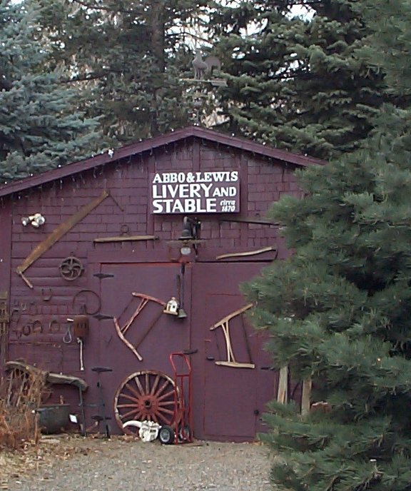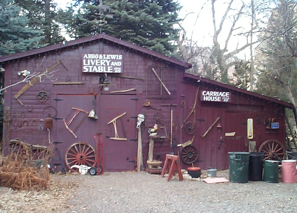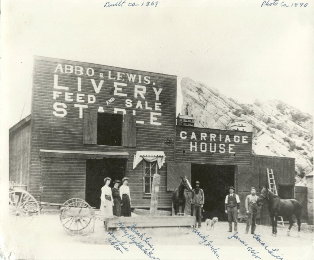 As we understand this, the original livery has been gone for some time. In this interpretation and restoration by Lila Horton, about half the original structure remains, with the original carriage house now labeled as the livery and the adjacent shed labeled carriage house.