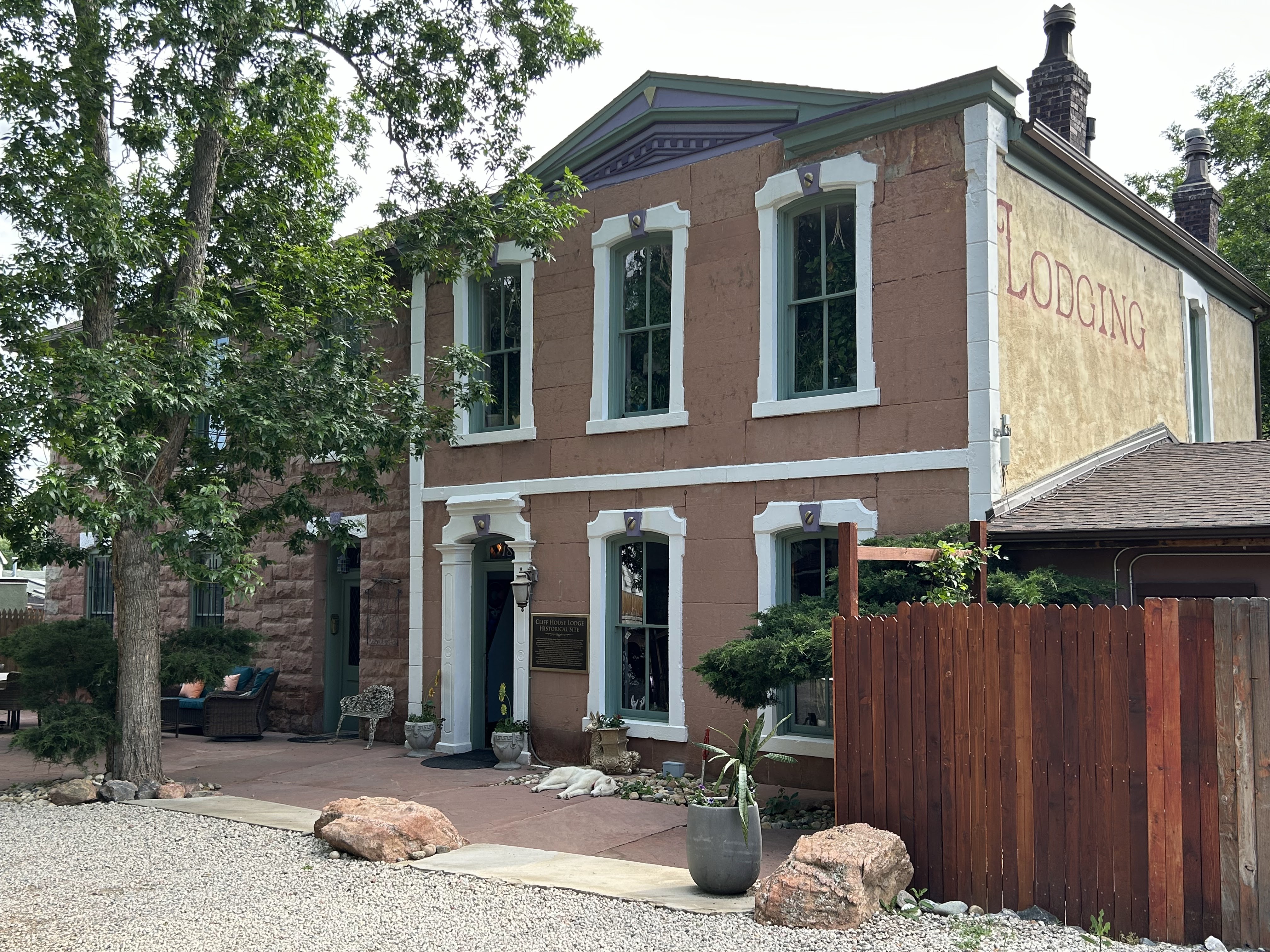 The original section was built in 1873. The house also has a wing extending east that was added in 1889. The newer wing is entirely red sandstone, probably from the nearby quarry, except the quoins, which are Morrison buff sandstone. The original section has both colors alternating in smoothly finished blocks (visible at rear side).