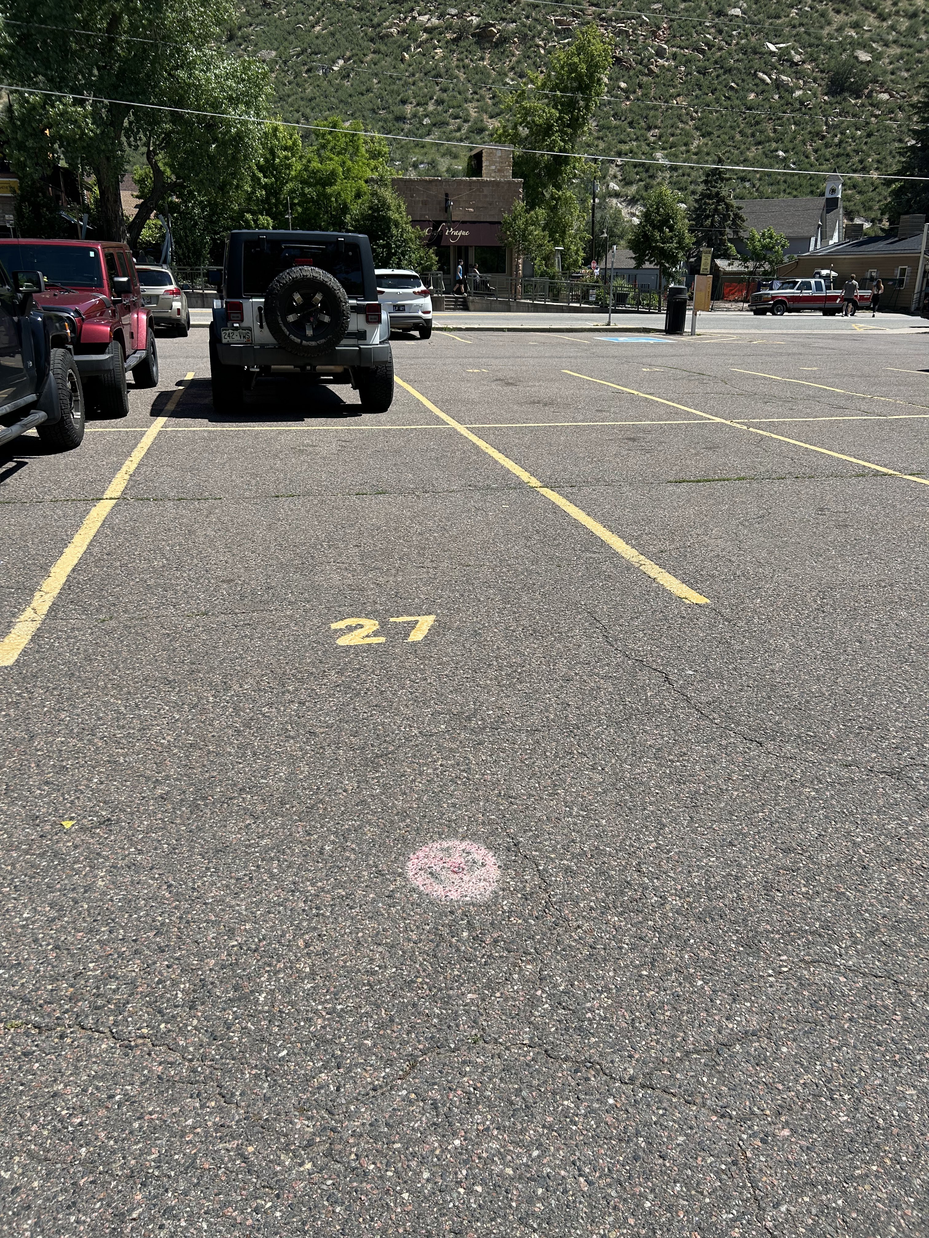 Spray painted circle marks the center of the railroad turntable. 2025 photo looking north toward #11 John Ross Hardware Building (Cafe Prague until early 2025)